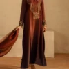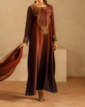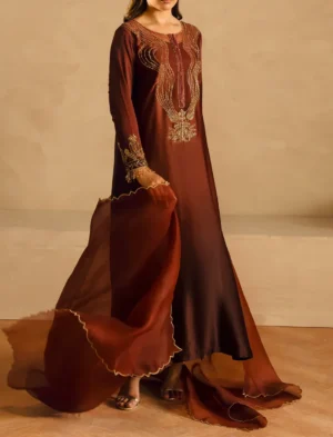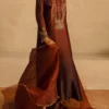 ‘Suffused in brown ombre, the charmeuse silk elongated a line silhouette is a study in understated opulence. Gold crystal and pipe work unfurl across the sleeves, and neckline, their intricacy elevating the ensemble . Paired with matching cigarette trousers and a pure organza scalloped dupatta – Brown Ombre channels elegance.