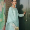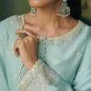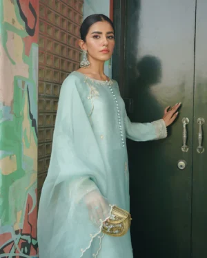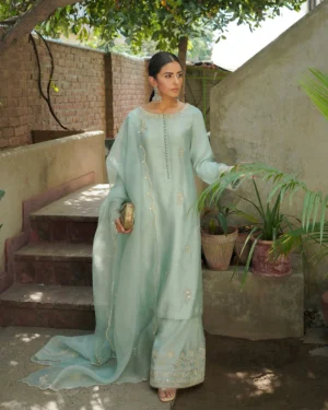 Showcasing exceptional craftsmanship, Calista is a true statement piece. Composed on a luxurious ice-blue cotton silk canvas, the shirt is adorned with resham and tilla embellishments that elevate the outfit to perfection. The embroidered cotton silk culottes and sheer organza dupatta serve as the perfect finishing pieces for a look that’s simply spellbinding.