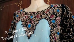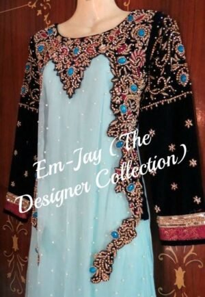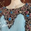 This elegant party-wear dress features a light blue chiffon base with full-hand embellishment. The design reflects refined craftsmanship, delicate detailing, and a graceful silhouette, making it perfect for special occasions and evening wear.