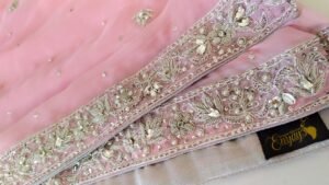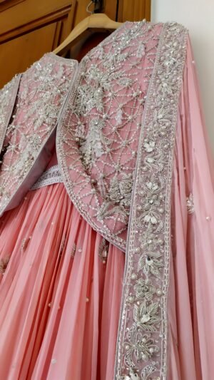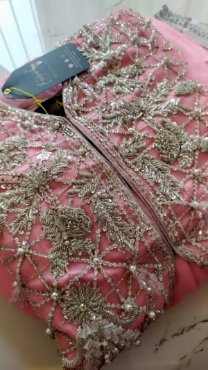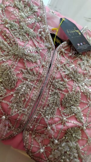 This dress was custom-designed for our client in Pakistan with specific attention to her personal preferences and style requirements. The design and embellishments were tailored to deliver an outfit that perfectly matches her vision.