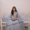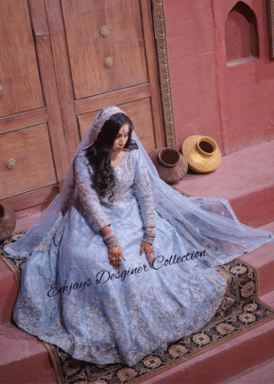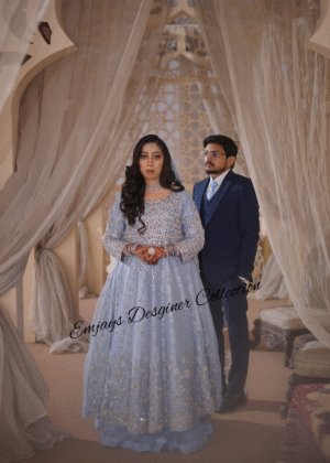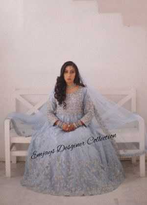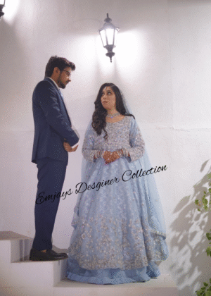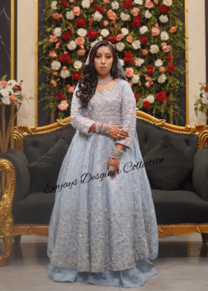 This dress was custom-designed for our client in Pakistan with specific attention to her personal preferences and style requirements. The design and embellishments were tailored to deliver an outfit that perfectly matches her vision.