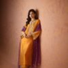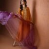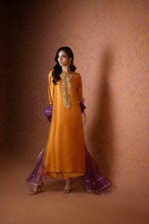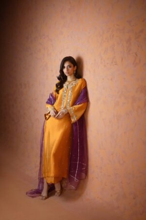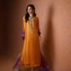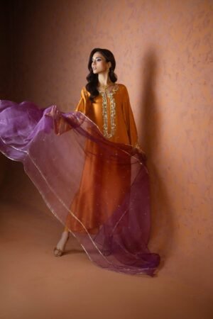 An elegant orange butter silk shirt adorned with intricate handwork of tikki stones, sitara, and cut dana, paired with matching culottes and a contrasting purple organza dupatta delicately embellished with chan all over. Perfect for weddings and festive occasions.