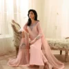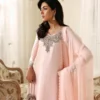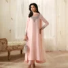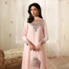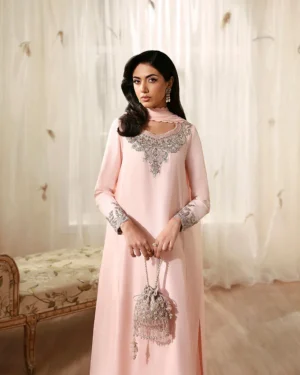 A masterful fusion of intricate embroidery and refined silhouettes, Eleya is truly spectacular. Crafted on blush pink Raw SIlk, the shirt and trouser are richly embellished with dabka, kora and cutdana adornments. Paired with an embroidered chiffon dupatta, this piece showcases opulent details that elevate your presence and help you transition seamlessly from day events to evening soirées.