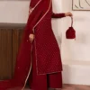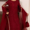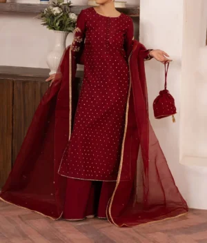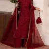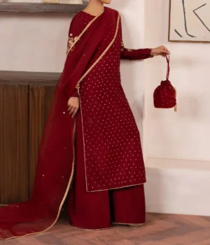 Command attention in rich mahroon red. This ensemble features a tissue silk shirt and trouser, complemented by a sheer organza dupatta. Intricate accents evoke timeless sophistication, perfect for those who love classic opulence.