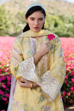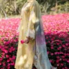 EMBROIDERED LAWN USE-9299 combines traditional craftsmanship with contemporary design. This three-piece ensemble features digitally printed lawn fabric on the front, sleeves, and bottom, complemented by intricately embroidered sleeve borders that add refined detail. The coordinating woven dupatta showcases digital printed stripes, completing a sophisticated look. Perfect for those seeking quality lawn wear with elegant embellishment and modern print aesthetics.