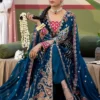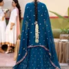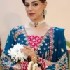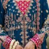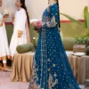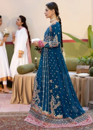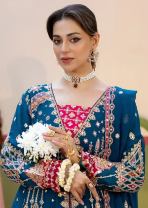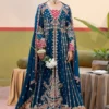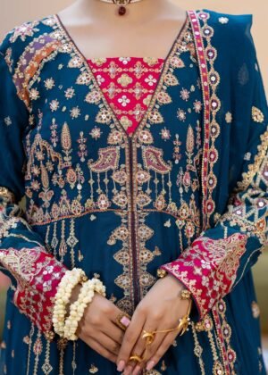 Teal dreams crafted in chiffon — a straight-cut embroidered maxi detailed with intricate patterns and silk borders, paired with an embroidered chiffon dupatta and a raw silk trouser for a graceful, timeless finish.