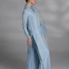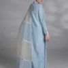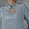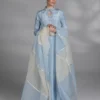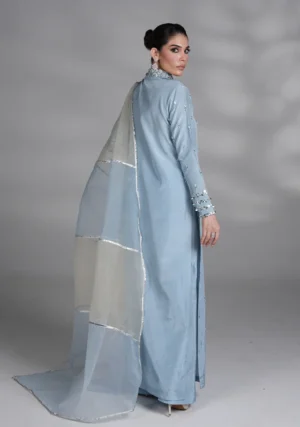 A ice blue premium silk long shirt featuring embellished details for a hint of sparkle, paired with matching premium silk straight pants & organza two color blocks dupatta.