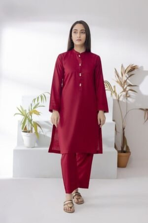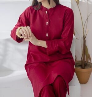 A sleek, solid-colored two-piece set crafted from soft, breathable cotton. Features a straight kurta with button detailing and matching trousers for an effortlessly refined everyday look. Ideal for casual outings and comfortable all-day wear.