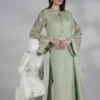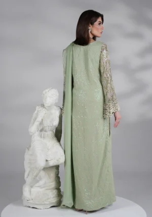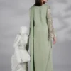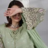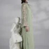 A mint green embroidered long shirt with delicate embellished sleeves, hand made dori tassles neckline, paired with plazo pants and chiffon dupatta with lace detailings.