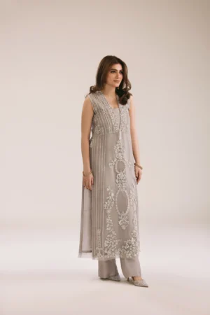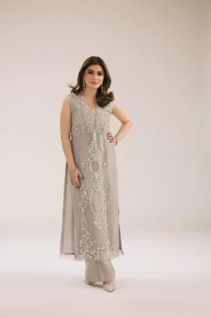 Crafted in silk Ketan organza, this ensemble is a vision of timeless luxury. Exquisite handwork of diamanté, pearls, and crystals creates a luminous shimmer across the airy silhouette, while the raw silk lining and bottoms provide structure, comfort, and a graceful fall.
