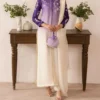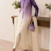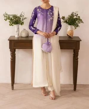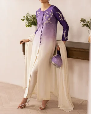 A captivating play of color, this ombre outfit transitions seamlessly across dual shades on tissue silk, with matching trousers for a harmonious look. The sheer organza dupatta adds fluidity and movement, embodying modern festivity with a classic touch.