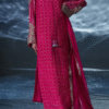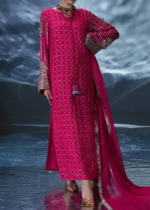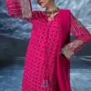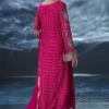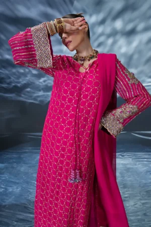 Shocking pink embroidered chiffon suit with handwork sleeves, Premium Raw Silk trouser & chiffon dupatta with lace detailing.