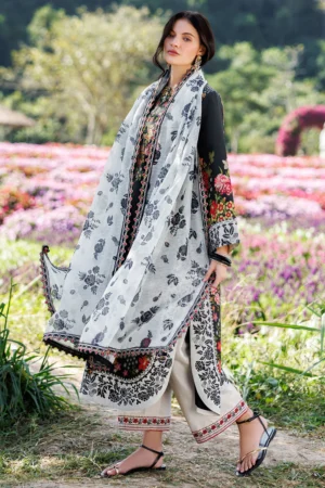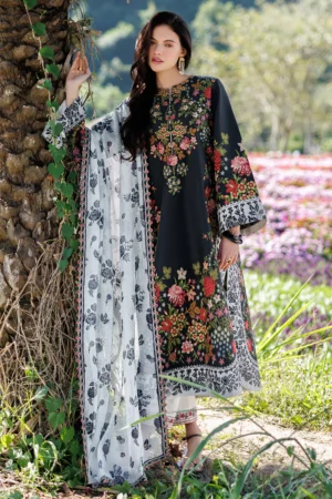 This three-piece lawn ensemble combines contemporary design with traditional craftsmanship. The digitally printed lawn shirt features vibrant, detailed patterns that showcase modern printing techniques, while the matching printed lawn bottom ensures a coordinated look. The woven dupatta, distinguished by its striped pattern and embroidered border, adds textural depth and elegance to the complete outfit. Crafted from premium lawn fabric, this collection offers breathability and durability suitable for Pakistan’s climate. The intricate embroidery on the dupatta border elevates the overall aesthetic, making this set ideal for both everyday wear and special occasions. A versatile investment piece that balances comfort with refined style.