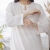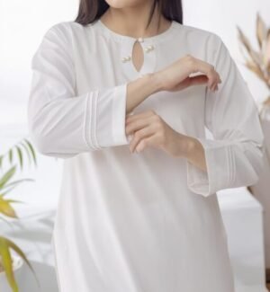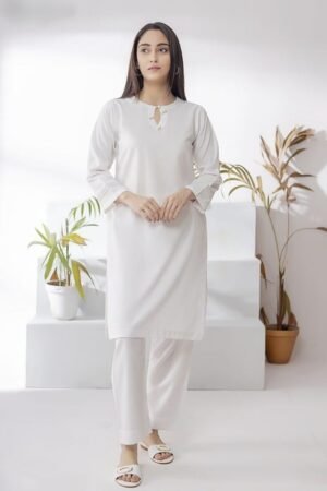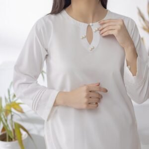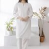 Discover timeless simplicity with this white two-piece kurta set for women. Designed with a pearl-detailed neckline and straight trousers, perfect for daily wear, office, and casual styling.